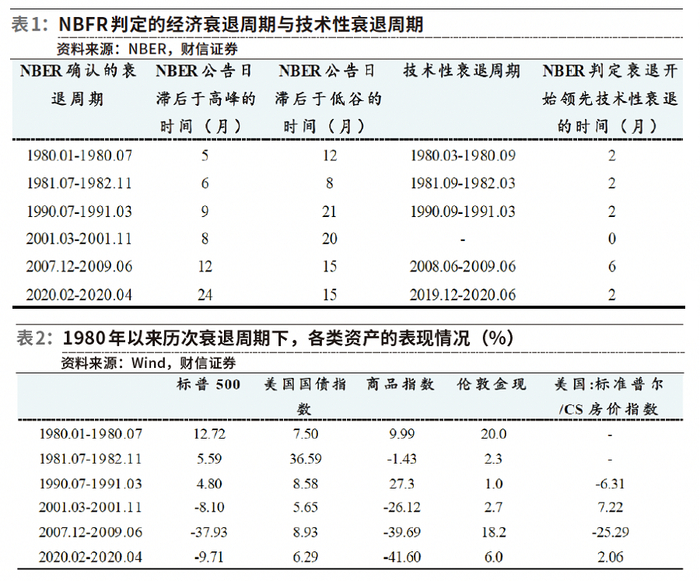 财信证券表示,由于NBER采取追溯确认的方法判定经济周期拐点,从而往往需要时间去等待数据公布,因此NBER定义的衰退存在一定滞后性。据1980年以来的历次衰退统计发现,NBER公告日期平均滞后于实际经济周期拐点11个月左右。其中,NBER公告日较确认的高峰日期滞后6个月左右,NBER公告日较确认的低谷日期滞后13个月左右。