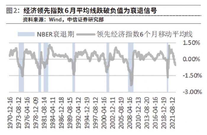 经济领先指数(LEI)由领先信贷指数、标普500股票价格指数、10年期美债和美国联邦基金的利率差、消费者对商业环境的平均预期、制造业每周平均工时等十个指标构成。从历史数据来看:在1980年以来的6次经济衰退中,LEI均在衰退前达到峰值,平均领先3个月左右;而当LEI的6个月移动平均线小于零时,一般意味着衰退的到来。