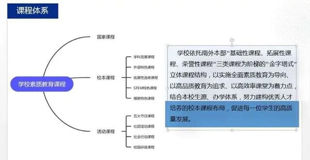 例如外语特色课程,学校全面继承南京外国语学校的外语特色,由两位江苏省特级、教授级高级教师领衔,超90%外语老师拥有硕士学位。在职英语教师都有至少一年南外本部教学经验,一年英语国家学习、生活经验,并有专任外籍教师开设英语口语课。