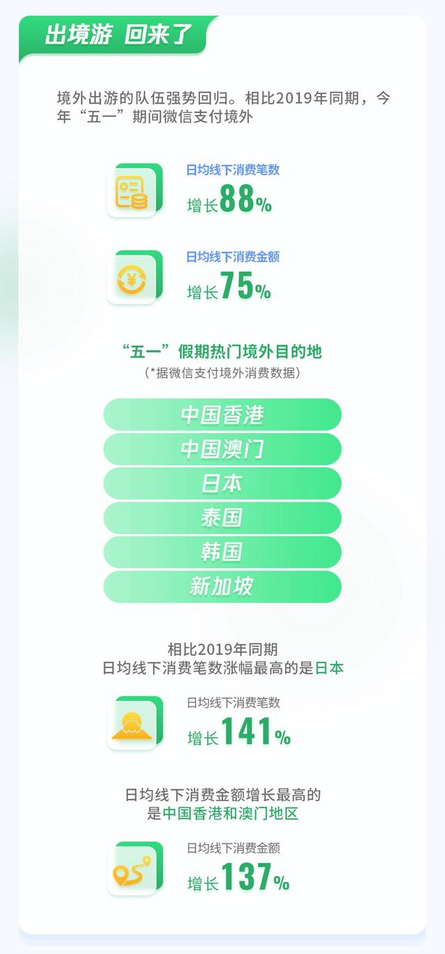 数据显示,“五一”假期出境游人均消费比2019年同期增长达40%。相比2019年同期,“五一”期间微信支付境外日均线下消费笔数增长88%,日均线下消费金额增长75%。
