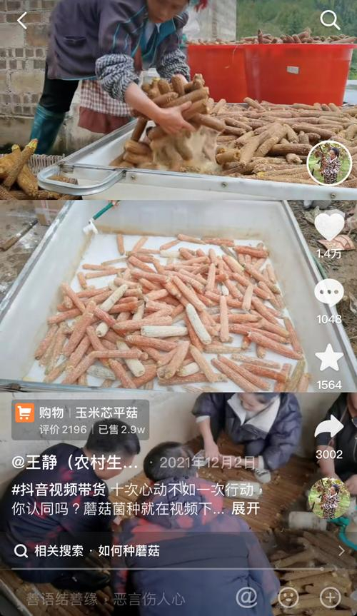 于是,王静开始转向分享和传播农业技术。在她的抖音账号里,1300多条短视频,绝大多数都是王静分享种植平菇、木耳、茯苓、黑皮鸡枞、灵芝、竹荪等各类菌种的内容,一条用玉米芯种平菇的视频就让她收获上百万点赞。在粉丝的呼吁下,她还推荐了不少食用菌棒、蘑菇盒等蘑菇种植材料。王静的粉丝中,一部分是觉得王静分享的蘑菇种植方法简单,只需在菌棒或蘑菇盒上喷点水就能出菇,在家里尝试、尝鲜;但还有相当一部分有规模化种植需求,希望以此增收。