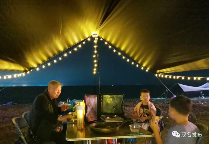 “全套”露营装备在海边“安营扎寨”,家人相聚畅聊,感受畅快的海风。