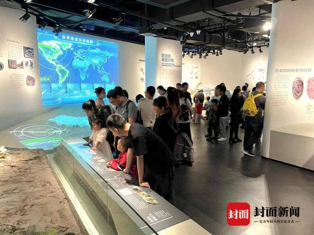 走进馆内,国内不可多得的巨型室内沙溪庙组地层剖面带来的地质知识科普大课堂让游客看了一遍又一遍,不舍离去。馆内长达19米的马门溪龙颈椎标本成为游客手机相册中的常客,而精彩、有趣的各类科普短视频则成为游客拍摄视频的主角。