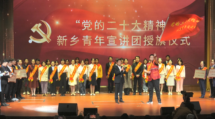 新乡市委常委、宣传部部长杨彦玲,新乡市委常委、组织部部长徐光华,新乡市人大常委会副主任郑援越,新乡市政府副市长朱东亚,新乡市政协副主席郭书佩为第二届新乡青年五四奖章个人代表和集体代表进行了颁奖,并为“党的二十大精神新乡青年宣讲团”授旗。