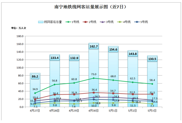 其中,4月30日,南宁地铁线网客运量创下历史新高,客运量为162.65万人次,客流强度1.30万人次/公里,全国排名第8。