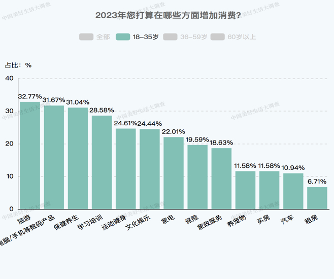 《中国美好生活大调查》最新数据发现,2023年,18-35岁年轻人的消费榜单前三位的是旅游(32.77%),电脑、手机等数码产品(31.67%)和保健养生(31.04%)。