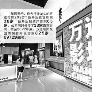 年报显示,作为行业龙头的万达电影2022年新开业直营影院38家,新开业轻资产影院65家,公司同时关停了33家直营影院。截至2022年底,万达电影在国内拥有开业影院825家、6972块银幕。