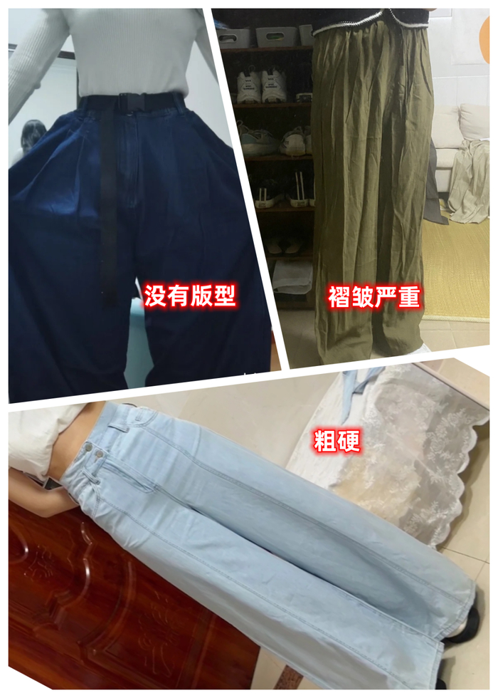 因为阔腿裤实在很火,为了赚块钱,市场上有很多厂家会用一些劣质的面料来以次充好:裤子粗硬、不透气;不仅整条裤子皱巴巴的,还没有版型可言。