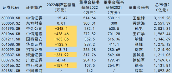 数据显示,不仅头部市值券商正在争先恐后降薪,全行业董秘薪酬均值明显下降。11家千亿券商中有8家的董秘2022年不同程度降薪,其中6人降幅金额超过100万元。