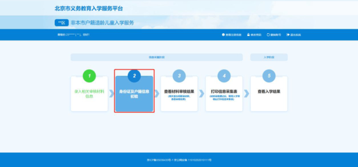 用注册时生成的账号和密码登录“非本市户籍适龄儿童入学服务”,登录系统后可点击页面中的“身份证及户籍信息核验”查看信息状态。如图10所示: