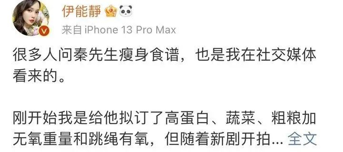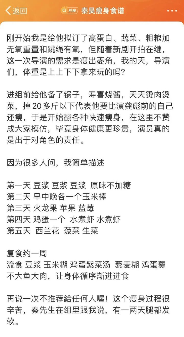 她也特别强调:“在这里不赞成大家模仿,毕竟身体健康更珍贵,演员真的是出于对角色的责任。再说一次不推荐给任何人!这个瘦身过程很辛苦,秦先生在组里跟我说,有一两天腿都发软。”