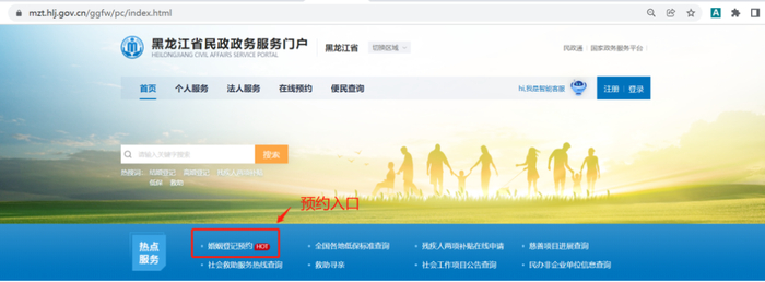 2.通过访问“黑龙江省民政政务服务门户”进行预约