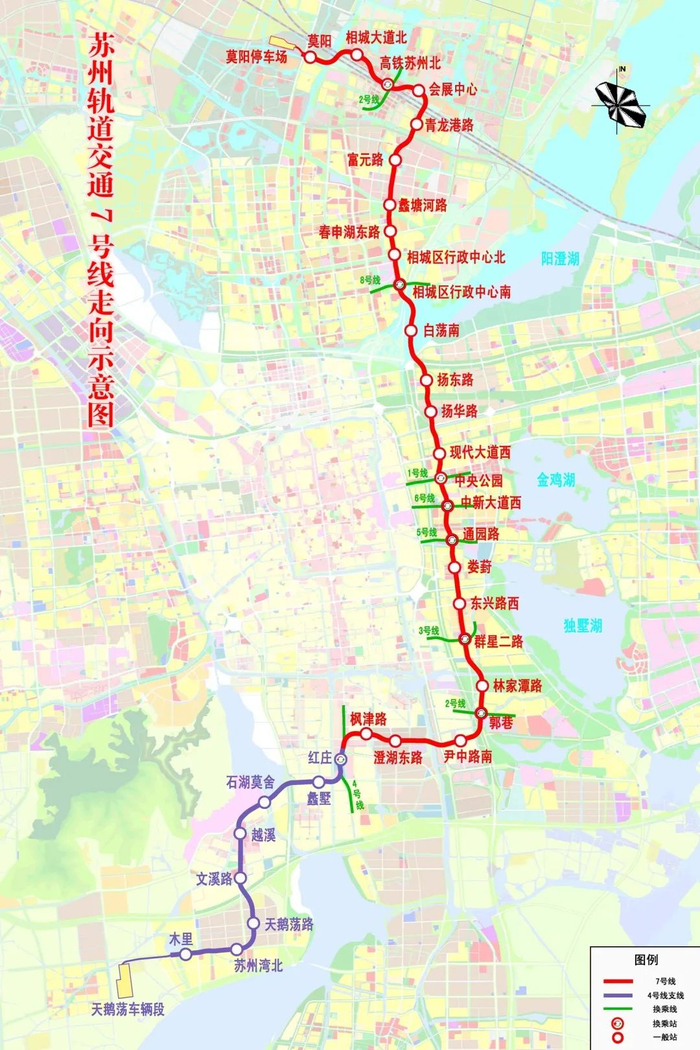 7号线起于相城区莫阳站,止于吴中区红庄站(不含),全长29.6公里,连接相城区、苏州工业园区、吴中区等多个城市中心,全线设站25座,均为地下站,建成后将与4号线支线贯通运营。