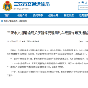 5月5日,三亚市交通运输局发布通知称,近年来,三亚市网约车平台及网约车数量快速增长,运力趋于饱和,违规经营现象突出。为进一步维护网约车行业市场秩序,保障乘客和其他经营者的合法权益,决定暂停受理网约车经营许可及运输证核发业务。