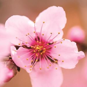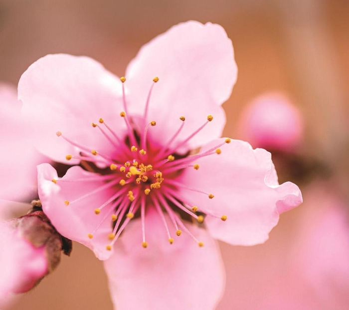 桃花像一位亭亭玉立的少女,花瓣挨挨挤挤的,像少女的衣裙,柔和、轻盈;花蕊像极了少女的手指,纤细、修长;桃花的茎像是少女的腿,托着花儿,美极了。