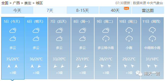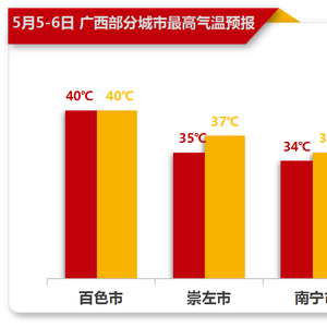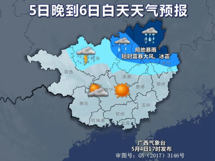 5日晚上到6日白天 ,桂北大部有阵雨或雷雨,其中桂东北部分地区有中到大雨、局地暴雨,并伴有短时雷暴大风、冰雹等强对流天气,我区其它地区多云到晴。桂西部分地区最高气温35~38℃、局地39℃以上 。