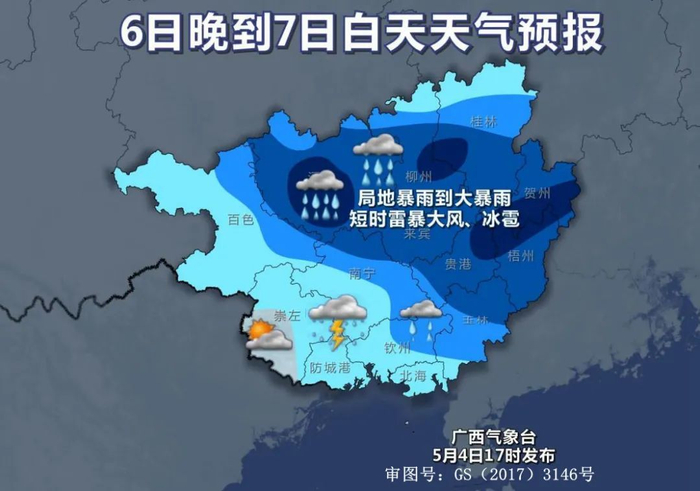 6日晚上到7日白天 ,桂北、桂东部分地区有中到大雨、局地暴雨到大暴雨,并伴有短时雷暴大风、冰雹等强对流天气,我区其它地区有阵雨或雷雨。