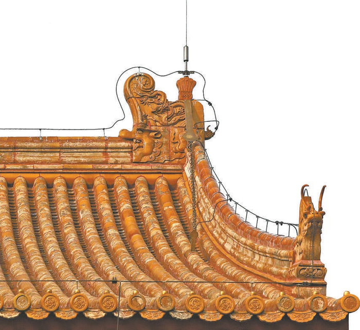 从1955年开始,故宫开始用现代科技手段来防雷。现在我们能看到古建筑的屋顶上有避雷针,而避雷针的造型、结构样式不同,搭配着各种古建筑。有些屋顶建筑面长度过大,一般放在两端吻上的避雷针保护不足,为了保护中间部位和屋脊上的小兽,工作人员增加延长了两吻间的避雷带,高于小兽,沿着屋脊,将雷击的电流通过接地装置引至地面。作者在书中还介绍道,考虑古建筑的重要性,一般的建筑接地电阻为10欧姆,而故宫的建筑则适当减低,定为5欧姆。接地体更是深埋,防止出现跨步电压伤人的问题。