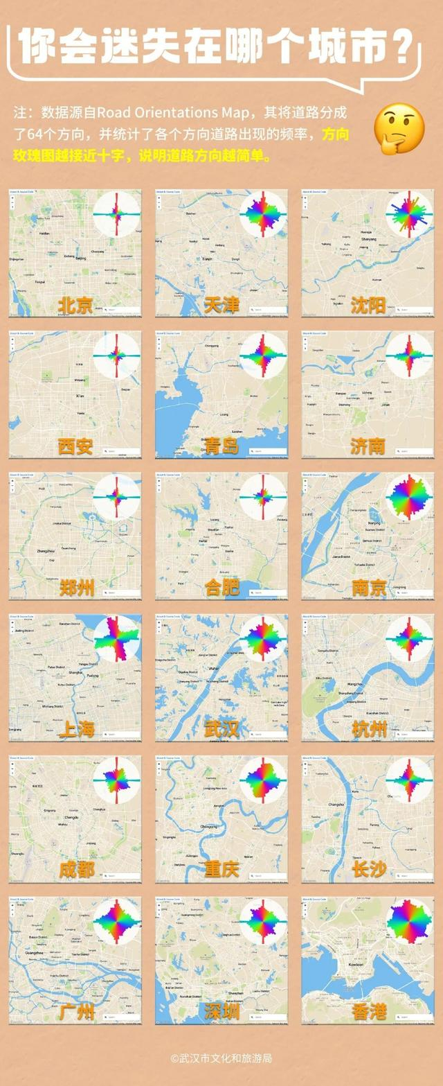 对比全国的玫瑰图,你会发现北方城市大多都是方方正正的东西南北路网,而武汉、重庆、香港等城市的道路方向就复杂多了。