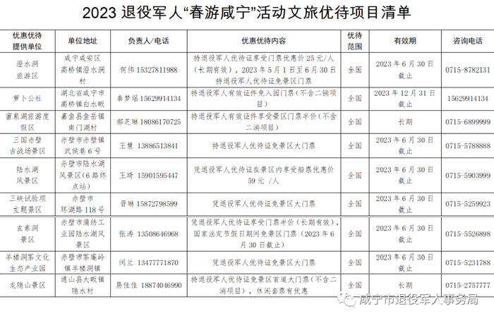 2023年3月14日湖北省退役事务厅联合省文旅厅、湖北文旅集团面向全国、全省退役军人发布的“春游湖北”文旅优待项目中含咸宁市15家景区↓↓↓