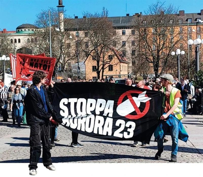 4 月 22 日,瑞典全国近 20 个城市举行活动,抗议在瑞典举行大规模国际军事演习、反对瑞典加入北约。人们手持标语牌和横幅,上面写着“对北约说不”“停止‘极光 23’”等抗议字样。图为当天人们在瑞典斯德哥尔摩参加抗议活动 新华社发 (帕特里克·埃克斯特兰德摄)