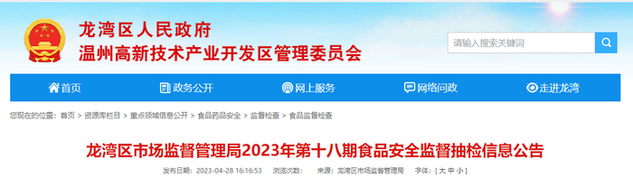 浙江省温州市龙湾区市场监督管理局公布2023年第十八期食品安全监督抽检信息
