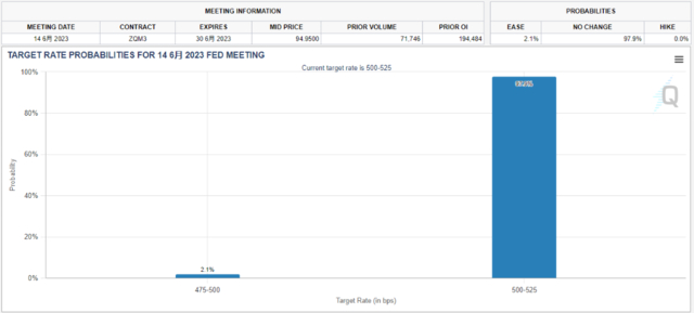 CME美联储观察数据显示,市场认为美联储6月暂停加息的概率为97.9%。