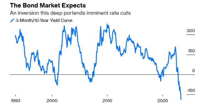 随着对经济衰退的预期愈演愈烈,“衰退曲线”3个月与10年期美债利差曲线也已经倒挂至30年来最为极端的情况。