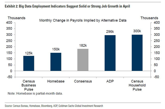 但应当注意的是,高盛所使用的“大数据就业指标”中包括了本周公布的强劲ADP数据,该数据显示,4月私营部门增加了29.6万个工作岗位,较3月份的14.2万翻倍,也几乎是预期值15万的两倍,这可能是影响高盛预期值异常偏高的重要因素。