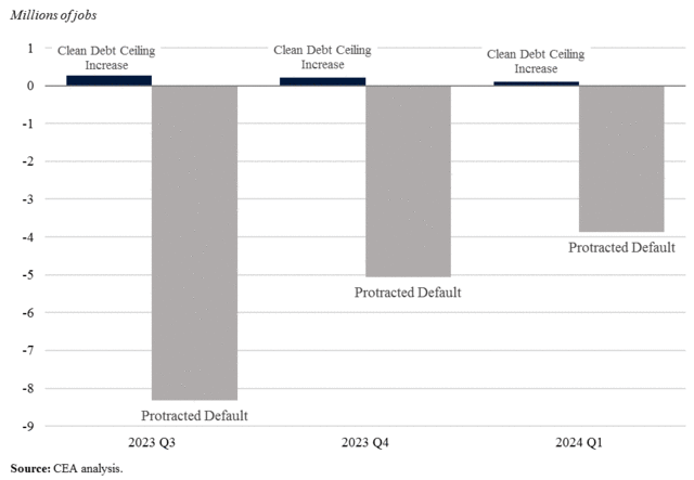 美国经济顾问委员会(CEA)周三公布的一份分析报告显示,短期债务违约将导致50万人失业,失业率上升0.3%,年GDP下降0.6%。白宫估计,如果债务违约持续一整个财季,股市将暴跌45%,GDP将下降6.1%,失业率将上升5个百分点。