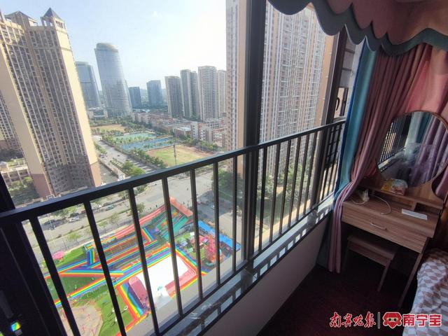 5月4日下午,记者来到南宁市江南区天健和府小区外围,看到该亲子游乐场位于沛阳路与沛友路交叉口旁,四面皆为小区高层居民楼。虽然当天是工作日,但亲子游乐场内还有几名家长带着小孩在游玩。记者随后来到谢女士家中,看到阳台与卧室窗口正对着亲子游乐场,偶尔还传来小孩子的嬉戏玩闹声。