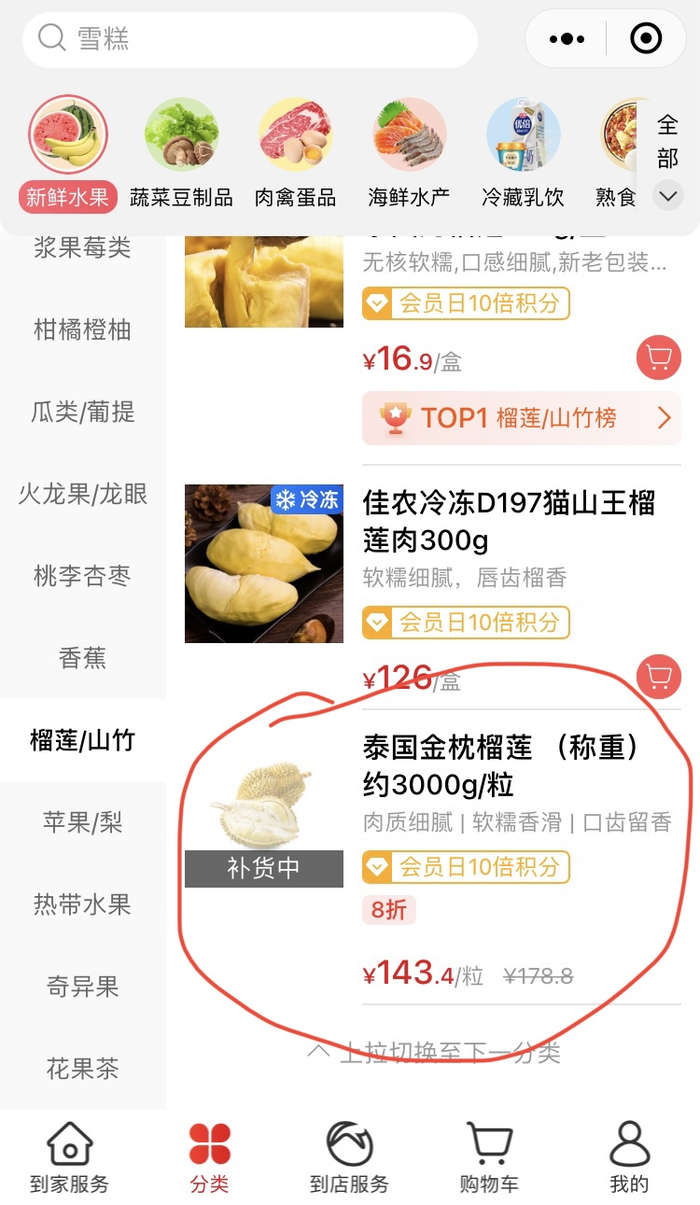 在大润发,以宁夏路大润发为例,其微信商城显示6斤左右的金枕榴莲,价格在143元左右,即23.9元/斤,价格也较为优惠,不过目前处于缺货状态。
