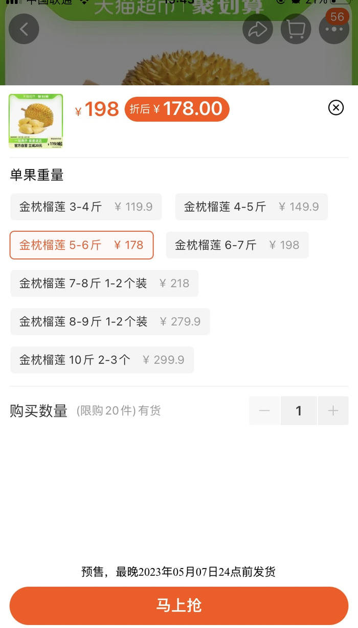 天猫超市也是差不多的情况,5-6斤的金枕榴莲售价为178元。