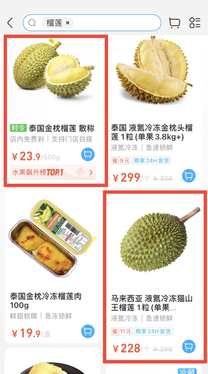 记者打开盒马APP,发现目前店内在售的有金枕和猫山王两个品种。其中,金枕榴莲的价格为23.9元/斤。而猫山王的售价相对较高,1.5kg的售价228元。