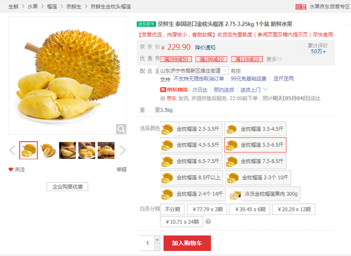 同样,在京东上键入“榴莲”等关键词进行搜索,再以“销量”作为衡量标准,销量最高的泰国金枕榴莲来自水果京东自营店,目前已累计评价50万+,以5.5-6.5斤的榴莲为例,价格为229.9元,算下来单价在38元/斤左右,比上述的商超贵一些。