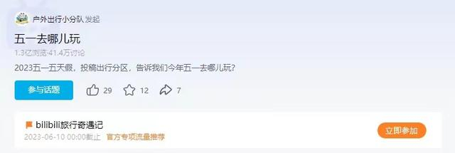 刚刚过去的五一假期里,人从众成为各个景区的“标志性景观”,部分公众为了躲避拥挤,选择了在视频中云游。来自B站的数据显示,4月29日至5月3日五天假期里,出行分区成为了热度最高的分区之一,其中涉及旅游出行类的日均视频投稿量达到31251个,同比增长119.7%,发布旅游出行相关视频的人数超9.3万人,同比增长67.5%。而话题#五一去哪儿玩#总浏览量达到1.18亿,总讨论量达到42.6万。