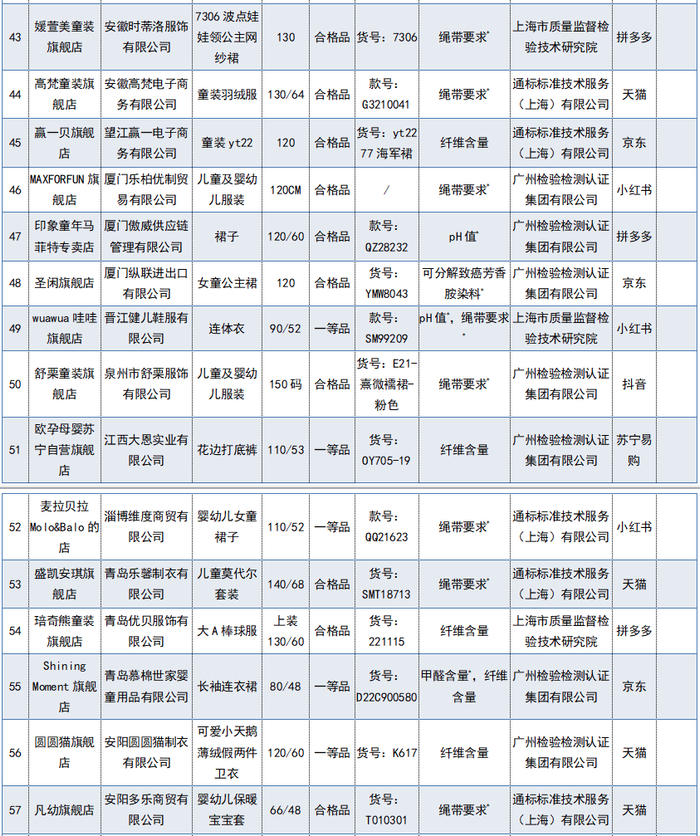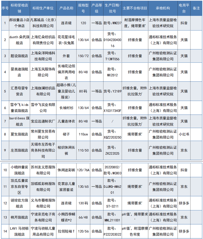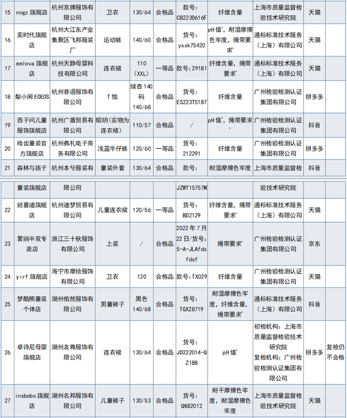 发现不合格项目为甲醛含量、pH值、可分解致癌芳香胺染料、耐干摩擦色牢度、耐湿摩擦色牢度、纤维含量、附件抗拉强力、绳带要求、附件锐利性。