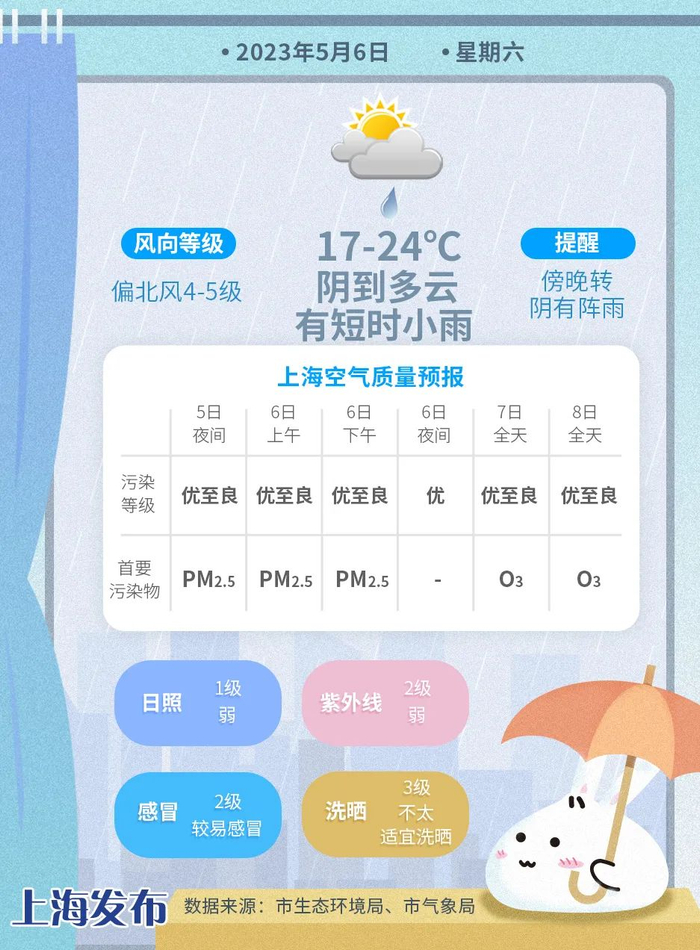 今夜到明天白天阴到多云为主,注意防范短时小雨突袭。弱冷空气影响下,明日气温较今日略有下调,全天在17-24度,吹的是4-5级的偏北风,相对湿度95%-55%,体感要比今天舒适一些。傍晚起上海再度转雨,晚归的朋友记得带好雨具。