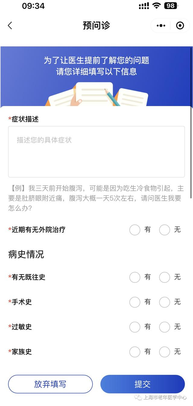 3.在就诊日期前24小时内,可点击“预问诊”按钮提前填写预问诊内容。