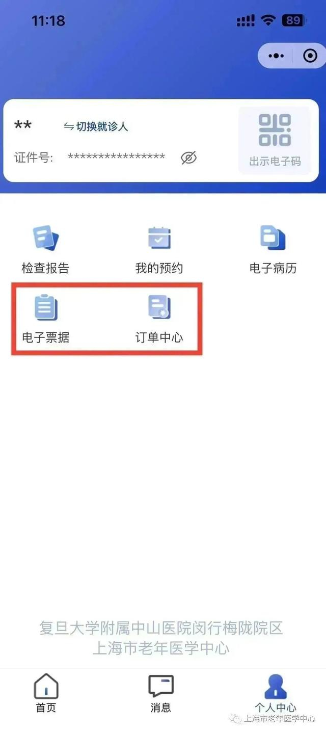 除上述入口之外,您还可在「个人中心」→「订单中心」中查看检查、检验、药品记录;并可通过点击「电子票据」复制电子发票链接并在浏览器打开查看电子发票。