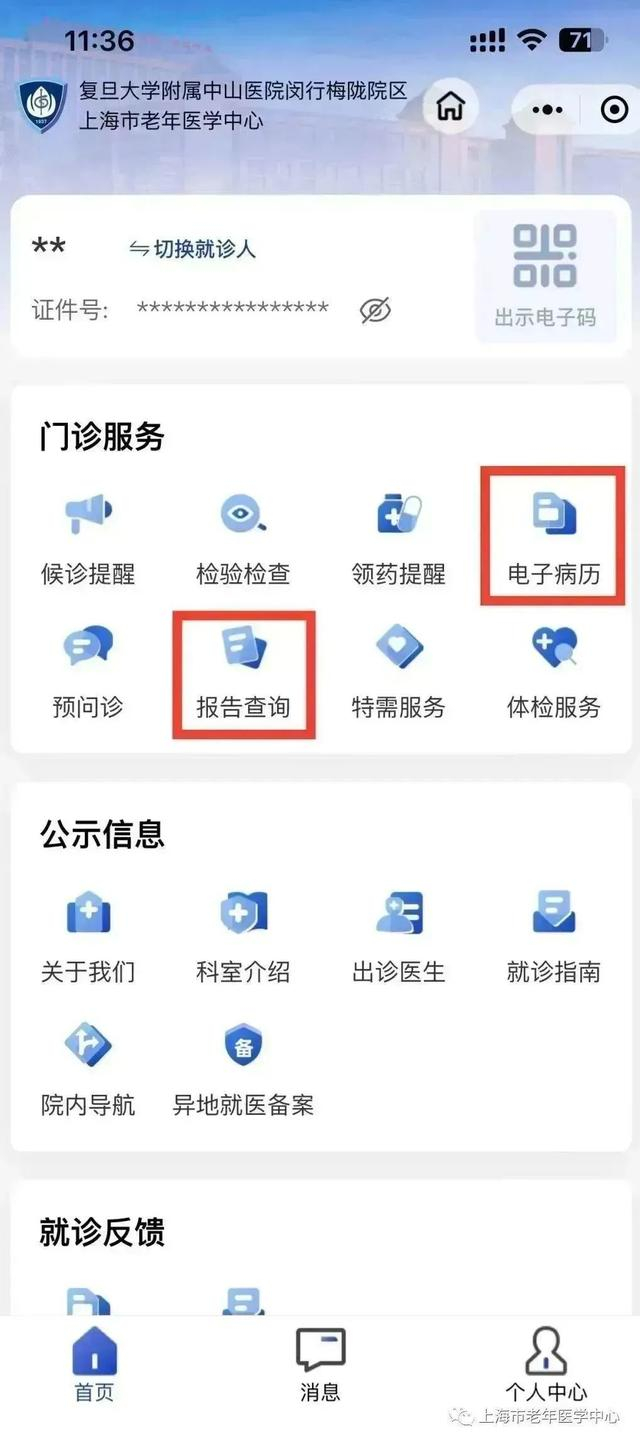 在就诊完成后,可点击「电子病历」查看电子病历(目前查看电子病历PDF版本的功能还在开发中,暂未开放);点击「报告查询」可查看PDF版检查检验报告,并支持下载。
