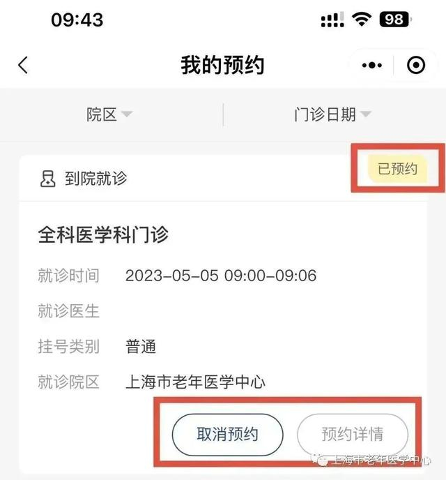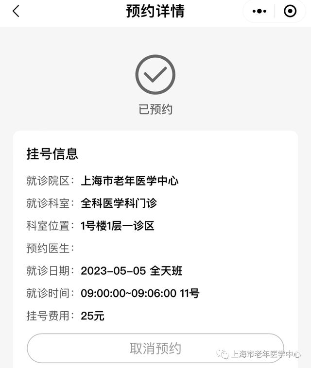 1)若就诊当日无法就诊,请于最晚提前一个工作日17:00前在此界面取消预约。