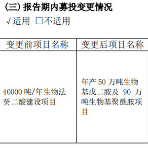 《科创板日报》记者注意到,公司最新公告中,公司还存在部分募投项目出现了变更的情况。年报显示,公司拟将募投项目“40000吨/年生物法癸二酸建设项目”募集资金投入金额由17.1亿元调整为5亿元,同时将募集资金的12.9亿元投入新项目“年产50万吨生物基戊二胺及90万吨生物基聚酰胺项目”。