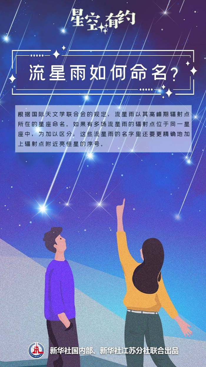 王科超解释说,依照人们的肉眼观察,同一场流星雨的流星看起来是从天球上的一个点发散出来的,这个点在天文学上称为辐射点。根据国际天文学联合会的规定,流星雨以其高峰期辐射点所在的星座命名。据此规定,宝瓶座η流星雨高峰期的辐射点在宝瓶座内,所以被冠以宝瓶座之名。而如果有多场流星雨的辐射点位于同一星座中,为加以区分,这些流星雨的名字里还要更精确地加上辐射点附近亮恒星的序号,比如α、η等。两个要素结合在一起,构成了流星雨的“怪名字”。