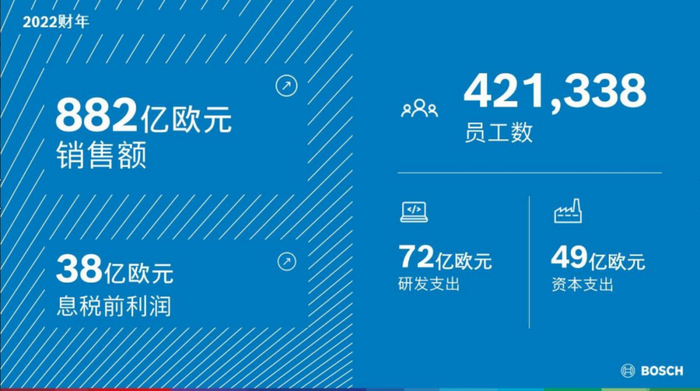 5月4日,博世集团召开了年度新闻发布会并发布了2022财年及2023一季度的业绩报告。年报显示,2022年,博世集团实现销售额882亿欧元,同比增长12%,调整汇率影响后的增幅为9.4%。息税前利润(EBIT)达到38亿欧元,息税前利润率升至4.3%。其中,汽车业务销售额为526亿欧元,同比增长16%,但利润率为所有业务中最低,仅为3.4%,主要在于未来重要项目的大量前期投资造成了一定的负担。