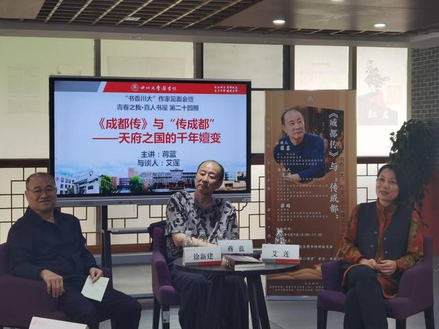 在互动环节,四川省社会科学院文学研究所所长艾莲说:“蒋蓝老师非常重视田野调查和现场考证,用行走的写作、学术的写作和诗意的写作展现天府之国的千年嬗变,《成都传》里融合多学科的研究方法,‘传成都’则体现出蒋蓝老师的社会关怀。他用脚步丈量土地,立足中国大地,以工匠精神打磨《成都传》,这是非常了不起的。”四川大学教授、文学与人类学研究所所长徐新建称赞,蒋蓝是四川大学文新学院特聘导师,这次受邀来四川大学江安校区图书馆做分享会,为师生们带来全新的体会,无论当下的环境如何改变,沉淀下来并专注写作才是作家的立身之本。四川大学文学博士、四川师范大学文学院讲师李国太刚从南充考察回来,对田野考察的辛苦深有同感:“这是非常繁重的体力劳动,蒋蓝老师能坚持身体力行地发掘历史真相,这种精神难能可贵”。