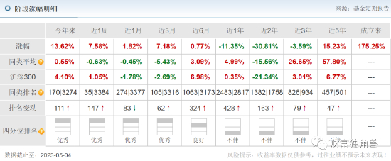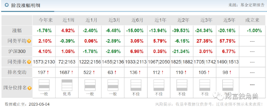 笔者发现,该基金的业绩并不理想,截至5月4日基金单位净值为0.8950,今年来收益率为-1.76%,近3月来收益率-6.48%,近1年来收益率-13.94%,近2年来收益率-39.53%。即使把时间周期拉长,该基金的业绩也是亏损,近3年来收益率-24.34%,近5年来收益率-20.16%;业绩大幅下降,基金排名处于殿后位置,基金状态不佳。