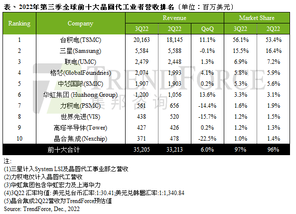 根据TrendForce集邦咨询研究,2022年第三季度,全球前十大晶圆代工业者营收排名中,晶合集成名列第十。不过,由于消费需求疲软,晶合集成受到终端客户订单修正冲击,在2022年第四季度落榜前十。