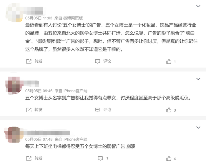 此番尖利的控诉引发了诸多不满和反感,有网友称其“宣传了女性的负面刻板印象”,“贩卖性别焦虑”,“用女博士做品牌名,广告却在辱女。”