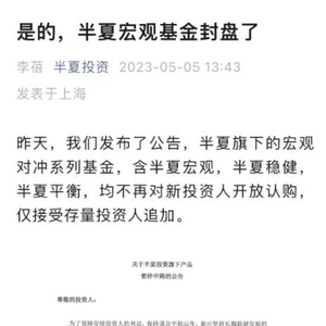 5月4日,百亿私募基金——上海半夏投资管理中心(以下简称“半夏投资”)发布公告称,自2023年5月8日起,暂停旗下存续私募基金产品对新客户的申购开发,已持有产品的投资人追加申购不受影响。